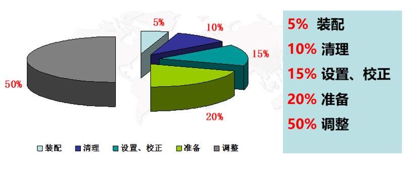 最初使用在汽車制造廠,以達(dá)到快速的模具切換(Exchange of Dies);豐田現(xiàn)場人員經(jīng)過長期探索,將沖壓工序沖床模具裝換調(diào)整所需時間,從1945年至1954年的3小時,縮短為1970年以后的3分鐘,現(xiàn)在,豐田汽車公司利用設(shè)備快速裝換調(diào)整SMED法,所有大中型設(shè)備的裝換調(diào)整作業(yè)均能在10分鐘之內(nèi)完成。企業(yè)產(chǎn)品切換時間由4小時縮短為3分鐘。