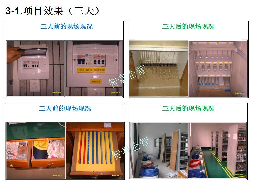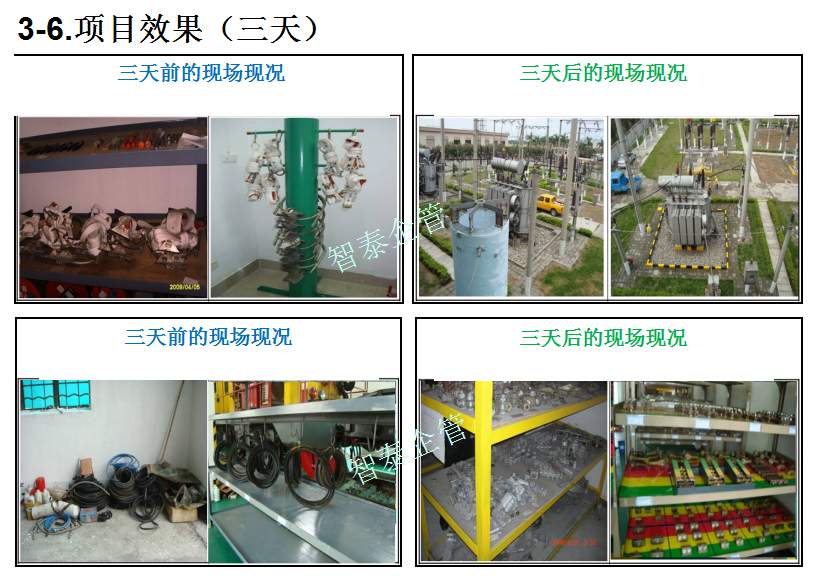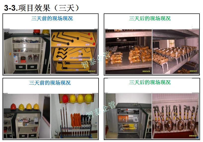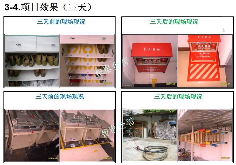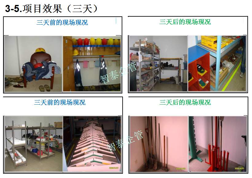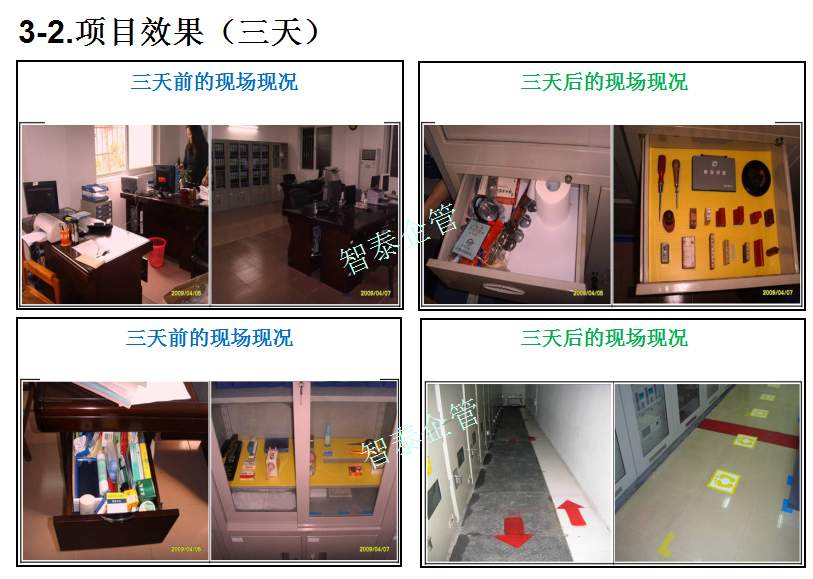 智泰咨詢下屬的5S管理公司首創(chuàng)的產(chǎn)品三天一標(biāo)桿,三天一條線,三天締造6~8個(gè)標(biāo)桿車間,智泰咨詢專業(yè)的顧問團(tuán)隊(duì)為企業(yè)的5S管理快速打造已形成一套標(biāo)準(zhǔn)內(nèi)容,能夠快速在企業(yè)全面推進(jìn)5S管理,附件為智泰咨詢?yōu)槟称髽I(yè)快速打造5S管理樣板區(qū)三天前后對(duì)比的現(xiàn)況,請(qǐng)查閱: