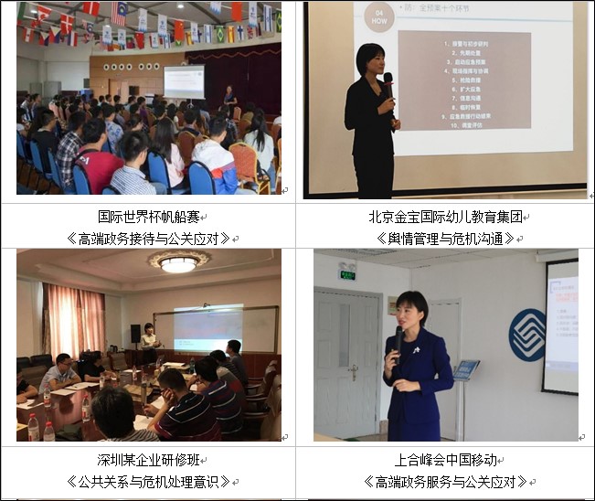 石慧老師擁有15年高級管理及企業(yè)公關(guān)管理工作經(jīng)驗,曾任職于世界500強企業(yè)擔任企業(yè)公關(guān)負責人,長期專注于危機公關(guān)、危機管理、媒體事件、突發(fā)事件應(yīng)急管理、領(lǐng)導(dǎo)人的公眾形象和高端商務(wù)政務(wù)客戶服務(wù)的研究和實踐,具有豐富的危機公關(guān)、媒體傳播、服務(wù)營銷培訓(xùn)和實戰(zhàn)經(jīng)驗,石老師吸收國內(nèi)外危機公關(guān)與國際商務(wù)禮儀理念,形成最符合中國企業(yè)在危機公關(guān)的應(yīng)對策略,幫助公關(guān)人員在應(yīng)對危機時,更能得體有效的應(yīng)對危機、化解危機,讓企業(yè)的品牌影響力更為有效的發(fā)揮。學(xué)員們都說石老師是目前在危機公關(guān)領(lǐng)域中難得的即懂得危機公關(guān)處理,又懂得國際禮儀的雙項講師,被譽為:危機公關(guān)老師中最懂國際商務(wù)禮儀,國際商務(wù)禮儀老師中最懂危機公關(guān)的老師“。石老師曾多次服務(wù)青島日報社、青島電視臺、青島人民廣播電臺、青島新聞網(wǎng)、《格調(diào)》高端雜志等國內(nèi)知名企業(yè)及媒體,足跡曾遍布國內(nèi)100余省、市,授課近500場次,學(xué)員近2萬人次,深受學(xué)員喜愛。