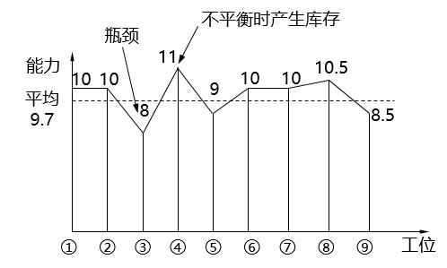 工廠中生產(chǎn)線工位生產(chǎn)能力不均衡示例: