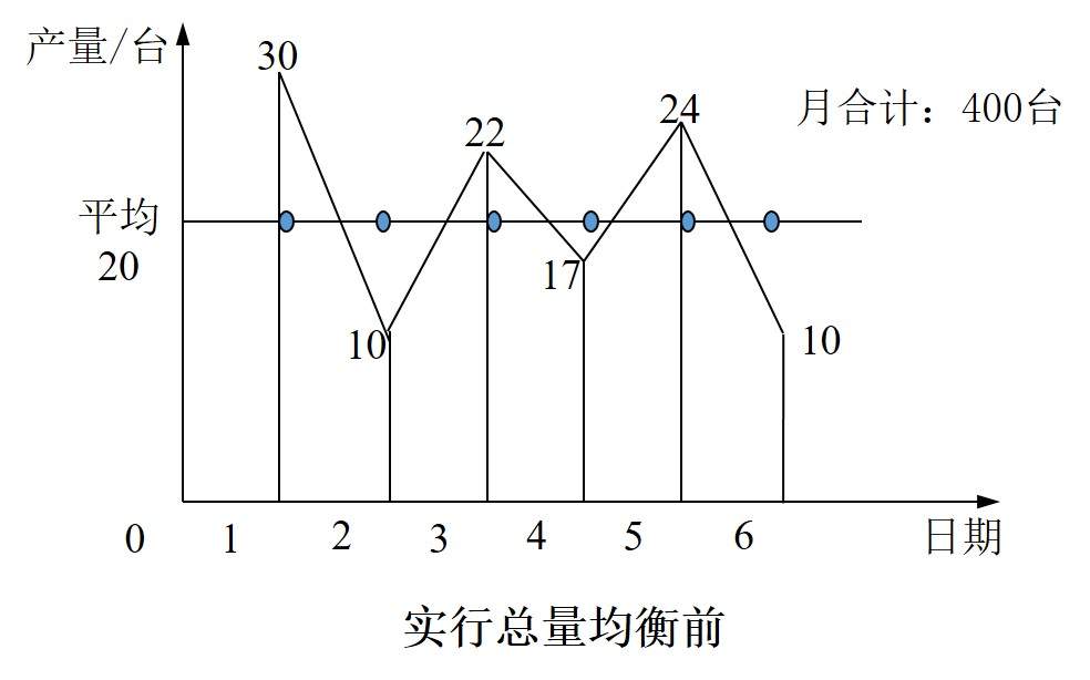 如果采用總量均衡的辦法,是日產(chǎn)量保持一致,即每天生產(chǎn)20臺,則可以按這個產(chǎn)量準(zhǔn)備人員以及生產(chǎn)要素。這樣,總產(chǎn)量沒有減少,人員以及生產(chǎn)要素卻可以減少1/3,成本也就隨之降低。