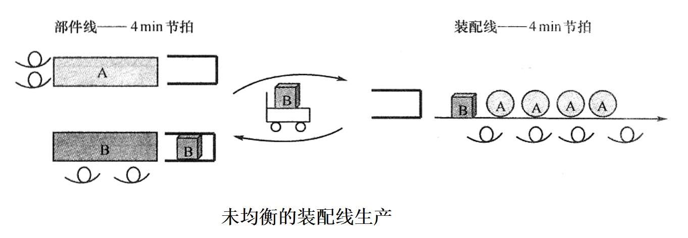 某汽車裝配線裝配A、B兩種車型,裝配順序是4個A型車和2個B型車循環(huán)。裝配線和部件線的生產(chǎn)節(jié)拍都是4min,生產(chǎn)部件A和B的工序都需要兩名操作工。由于車型的不同而需要不同的部件,即裝配A型車需要用到A部件,裝配B型車需要用到B部件,如下圖所示。