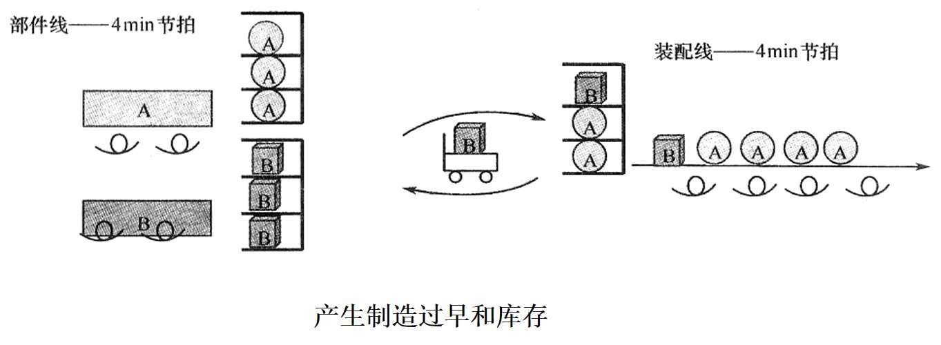 (1)如果按照準(zhǔn)時化的生產(chǎn)要求進(jìn)行生產(chǎn),當(dāng)后工序裝配線裝配B型車時,需要使用B部件,則生產(chǎn)A部件的生產(chǎn)線等待,反之亦然,這樣就造成了等待的浪費。