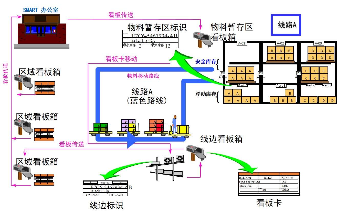 4.按看板補(bǔ)充下工序零件,同時(shí)取出在制品超市中零件看板(看板交換)