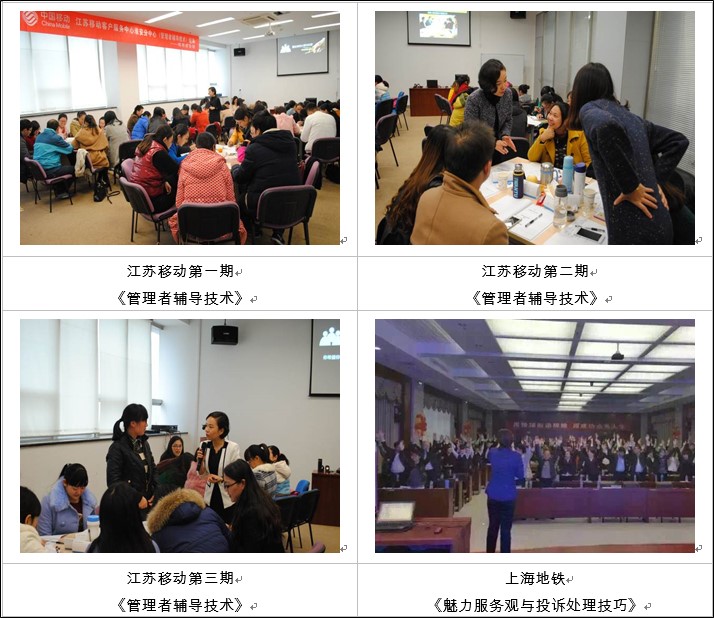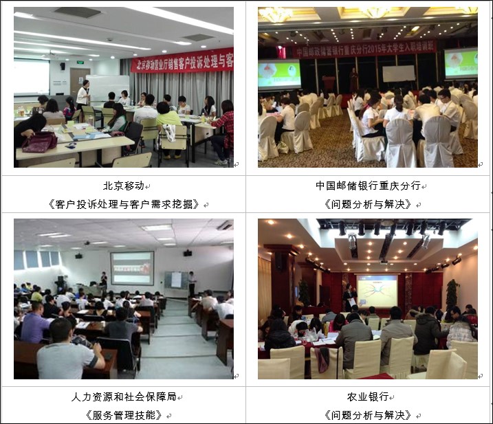 曾受邀兄弟單位及省級醫(yī)院、電力系統(tǒng)做《打造營業(yè)廳服務(wù)藍(lán)圖》及《客戶投訴處理培訓(xùn)》、《問題分析與解決》,得到業(yè)界的高度認(rèn)可,好評如潮