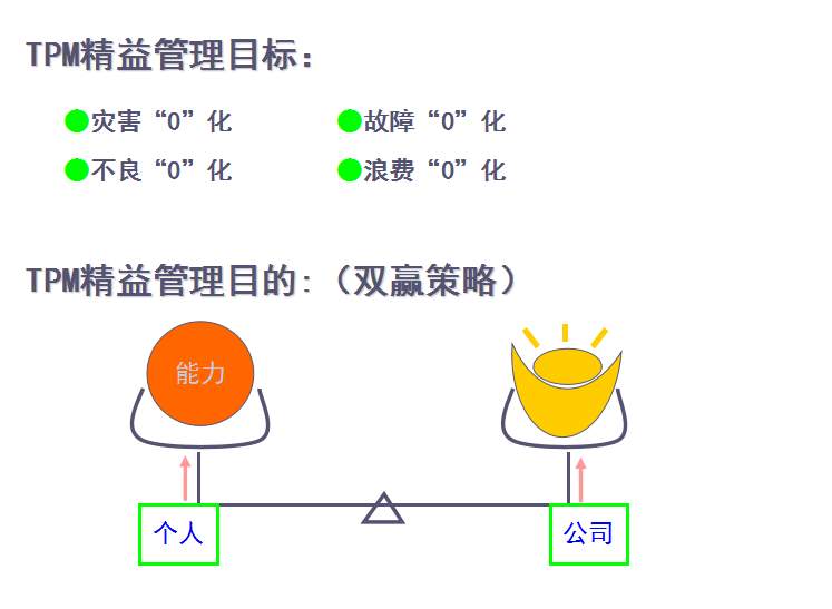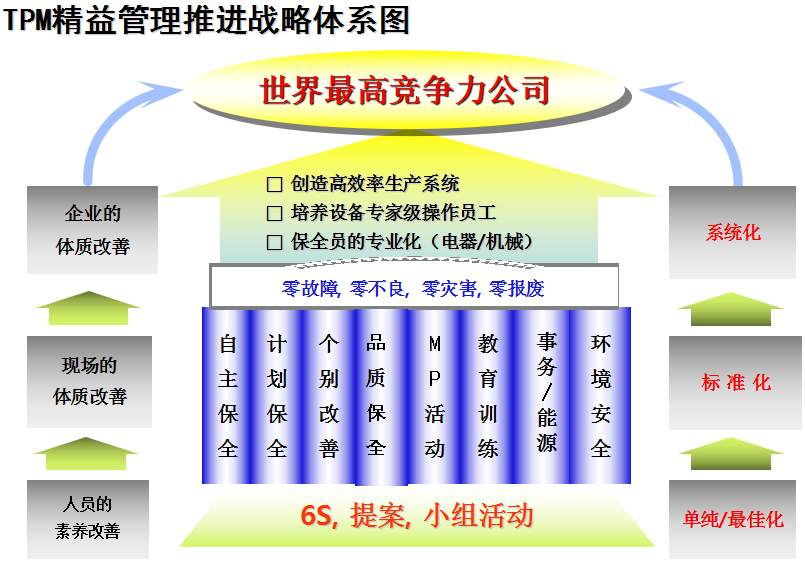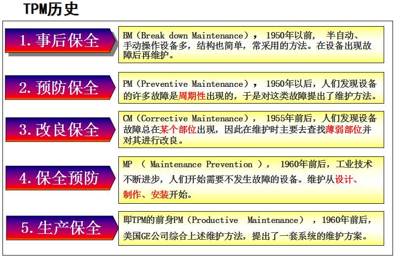 TPM咨詢公司中對于TPM管理的解釋是英文Total Productive Maintenance的縮略語,中文譯名叫全員生產(chǎn)維護(hù),又譯為全員生產(chǎn)保全:《T (Total)全員 所有部門全員參加的意思;P (Productive)生產(chǎn) 效率提升追求故障 0 化, 不良 0 化, 災(zāi)害 0 化,浪費(fèi) 0 化;M (Maintenance)維護(hù)(保全) 追求極限效率為目的生產(chǎn)體系維持理想狀態(tài)的活動》。這是日本人在70年代提出的,是一種全員參與的生產(chǎn)維護(hù)方式,其主要點(diǎn)就在“生產(chǎn)維護(hù)”及“全員參與”上。通過建立一個全系統(tǒng)員工參與的生產(chǎn)維護(hù)活動,使設(shè)備性能及員工綜合技能達(dá)到最優(yōu)。TPM咨詢管理的提出是建立在美國的生產(chǎn)維護(hù)體制的基礎(chǔ)上。在非日本國家,由于國情不同,對TPM的理解是:利用包括操作者在內(nèi)的生產(chǎn)維護(hù)活動,是以提高OEE(設(shè)備綜合效率)為目標(biāo),以全系統(tǒng)的預(yù)防維護(hù)為過程,全體人員參與為基礎(chǔ)的設(shè)備保養(yǎng)和維護(hù)管理體系。