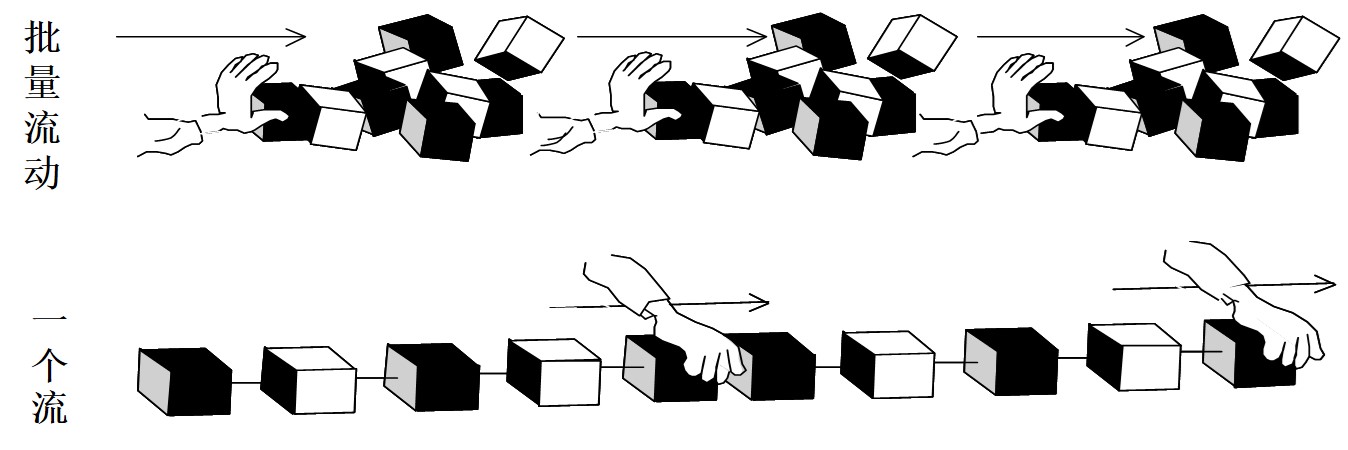 “一個(gè)流”生產(chǎn)的第一要點(diǎn)就是要使產(chǎn)品生產(chǎn)的各道工序做到幾乎同步進(jìn)行,使產(chǎn)品實(shí)現(xiàn)單件生產(chǎn)、單件流動(dòng)。單件流動(dòng)是為了避免以批量單位進(jìn)行加工,前道工序的加工一結(jié)束就立刻轉(zhuǎn)到下一道工序,從而使得工序間在制品的數(shù)量接近于零。