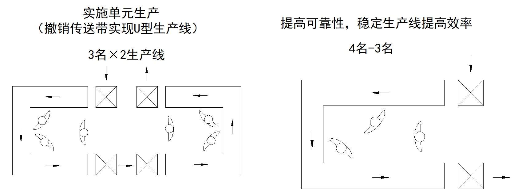 如果將生產(chǎn)設(shè)備一字?jǐn)[開,工人從第一臺(tái)設(shè)備到最后一臺(tái)設(shè)備就需要走動(dòng)很遠(yuǎn)的距離,從而造成嚴(yán)重的人力浪費(fèi)。因此,“一個(gè)流”生產(chǎn)要求將生產(chǎn)設(shè)備按照“U”字型來(lái)排列,從入口到出口形成一個(gè)完整的“U”型,這樣就可以大量的減少由于不同工序之間的傳遞而造成的走動(dòng),減少時(shí)間和搬運(yùn)的浪費(fèi),增加生產(chǎn)效率。